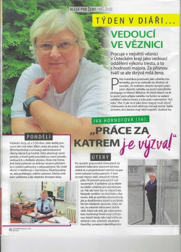 Ve 4. čísle letošního ročníku Blesku pro ženy dala čtenářkám nahlédnout do svého pracovního týdne vedoucí oddělení výkonu trestu Věznice Bělušice mjr. Mgr. Ivana Hornofová.